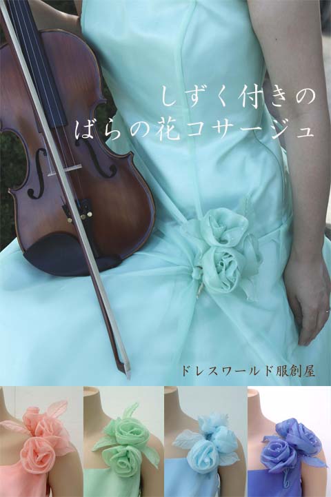 しずく付きのばらの花コサージュ ピンク グリーン 緑 ブル