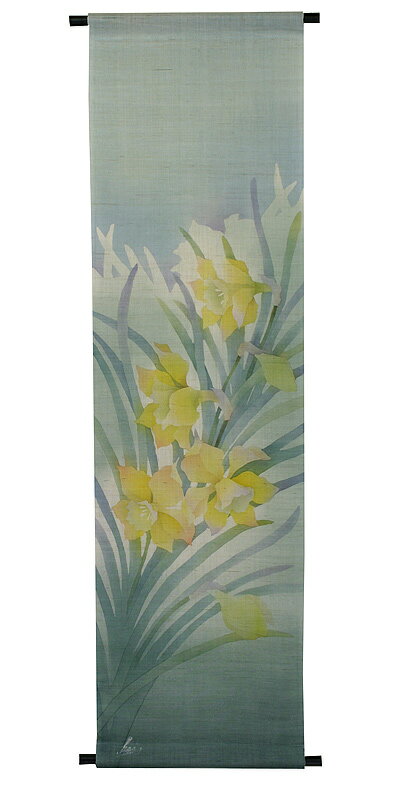 ギフト対応 タペストリー・水仙春近く/長田けい子 素 材:麻 サイズ:約36×130cm 技 法:ローケツ染 化粧箱・上下棒付き ■かさ音工房の作品はフリーハンドにてロウを 置き彩色をして行く為、デザインや色彩に弱冠 の相違が生じる場合がありますので 、ご了承 下さい。 ■左の画像をクリックすると大きな画像となります ■お手入れは出来るだけ、ドライクリーニングを お奨めします。 和風モダンのインテリアをお考えの方にお奨めです 【この様な時にもお使い下さい】 新築祝/結婚祝/お中元・お歳暮/開店祝い/お誕生日/父の日・母の日/敬老の日/引越し祝い ■熨斗書きも、ご自由にお